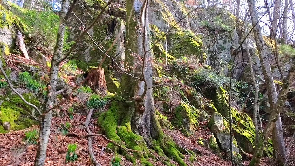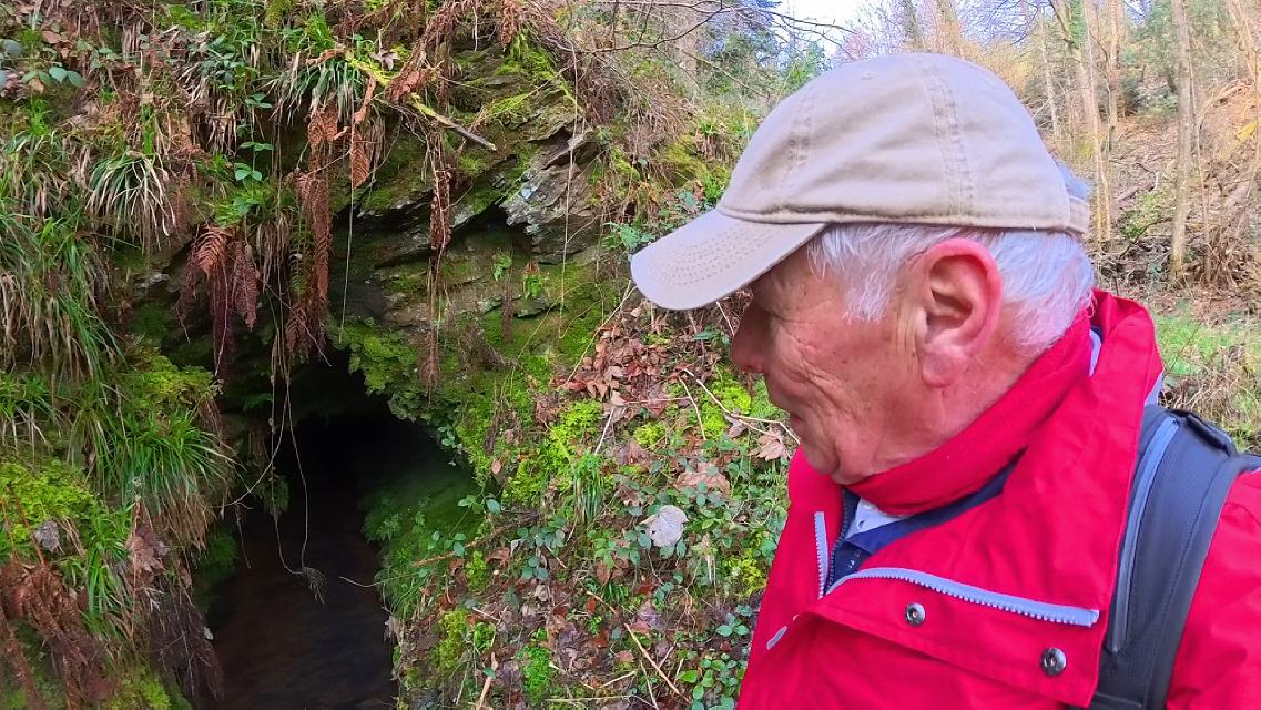 Station 7: Der Verlauf des Urgrabens vom 22 km entfernten Platten am Osthang des Kandel hatte seinen Grund, denn auf dieser Seite des Bergmassives fehlte das benötigte Wasser. An diesem Standort führt der heutige Wanderweg exakt auf der Trasse des ehemaligen Wassergrabens - und dieser musste damals kunstvoll um die Felsvorsprünge herumgeführt werden. Die Breite des Urgrabens betrug maximal einen halben Meter.