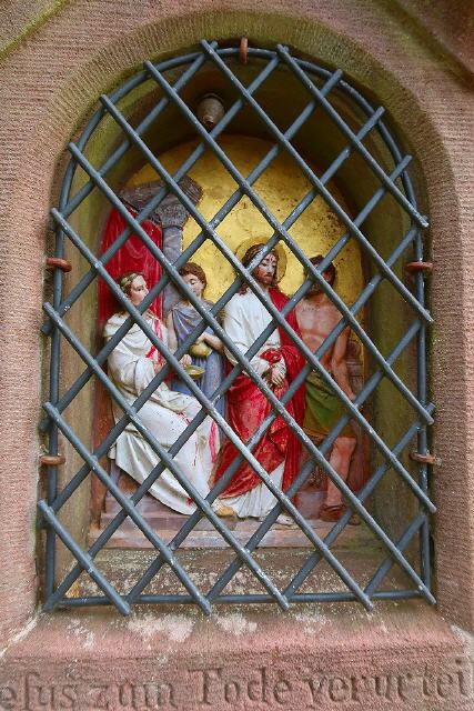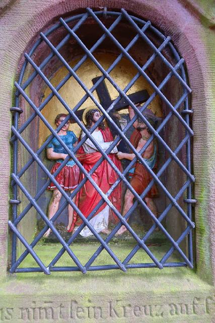 Die Hafnerhofbäuerin Theresia Volk und der Dorfpfarrer Störk kamn 1887 überein, am Wallfahrtsweg eine Ölberggrote zu errichten. Franz Simmler aus Offenburg wurde beauftragt, eine Christusstatue aus Kiefernholz zu schaffen. Am 14. Juli 1889 war feierliche Einweihnung. Waldameisen und Feuchtigkeit zerstörten jedoch das Werk. Im Winter 1896 / 97 wurde von Kochendörfer aus Waldkirch eine Kopie aus Vogesensandstein erstellt. Am 21. März 1897 weihte Pfarrer Fuchs das Bildnis ein. Eine unbekannte Frau spendete kurze Zeit später eine Engelsskulptur mit Kelch. In der Pandemie wurde dieser schöne Engel von Unbekannten geköpft. Eine Restauration scheint nicht geplant zu ssein. Der Engel kehrte also nicht an seinen Platz zurück.
