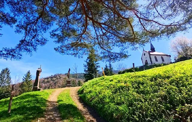 Die schon von weitem sichtbare Kreuzbergkapelle bei Buchenbach liegt auf 568 m Höhe. Von dort hat man bei guter Sicht einen ausgezeichneten Blick über das ganze Dreisamtal nach Freiburg bis hin zu den Vogesen. Ein schön angelegter Kreuzweg mit 14 Stationen führt vom Hitzenhof aus in Buchenbach hinauf zur Kapelle. Bild antippen!