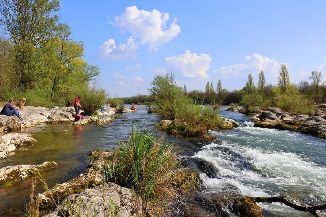 Westlich von Efringen-Kirchen zeigt sich der Rhein von einer ganz anderen Seite. Mitten im Altrhein liegen unzählige Inseln, Felsblöcke und Sand- sowie Kiesstrände. Waren die Isteiner Schwellen früher eine Gefahr für die Schifffahrt, locken sie heute Urlauber und Erholungssuchende an. Bild antippen!