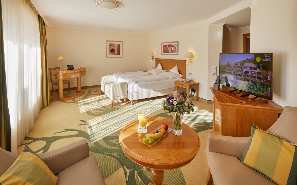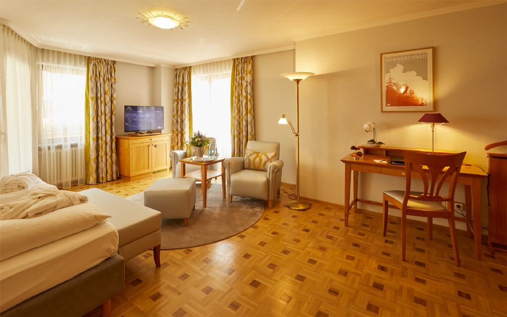 Junior-Suite Glottertal. Junior-Suite, 48 qm, möblierter Balkon 12 qm oder Loggia 6 qm, Südwestseite zum Garten, mit Nachmittags- und Abendsonne. Das Interieur dieser beiden Suiten verzaubert Sie mit geschmackvollem Landhausstil gepaart mit modernem Edel-Touch: Die Suiten Glottertal bestichen durch ihre unaufdringliche Behaglichkeit in einem perfekt abgestimmten Mix aus charmanten Stilelementen. Warme Hölzer und heitere Farben schaffen ein behagliches Wohn-Ambiente. Ein geräumiges und ruhiges Doppelzimmer mit Nachmittags- und Abendsonne, das Ihnen einen herrlichen Blick auf die gepflegten Gartenanlagen gewährt.