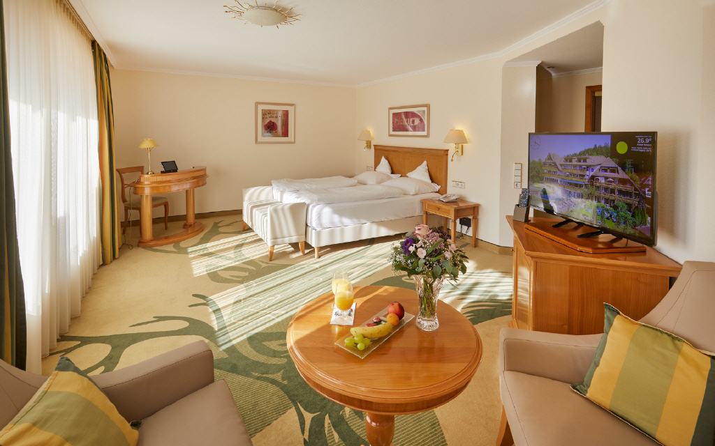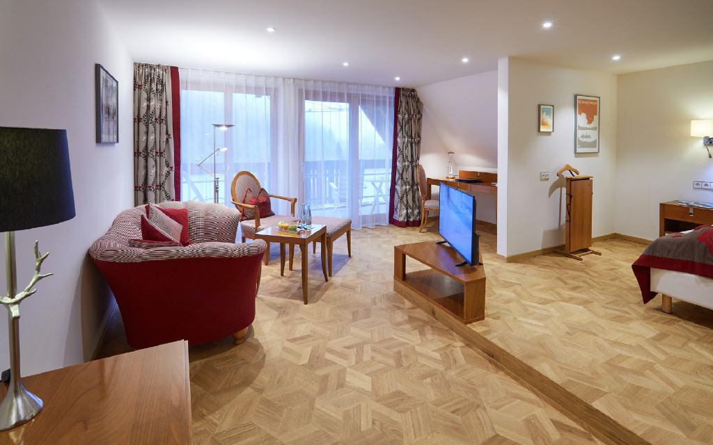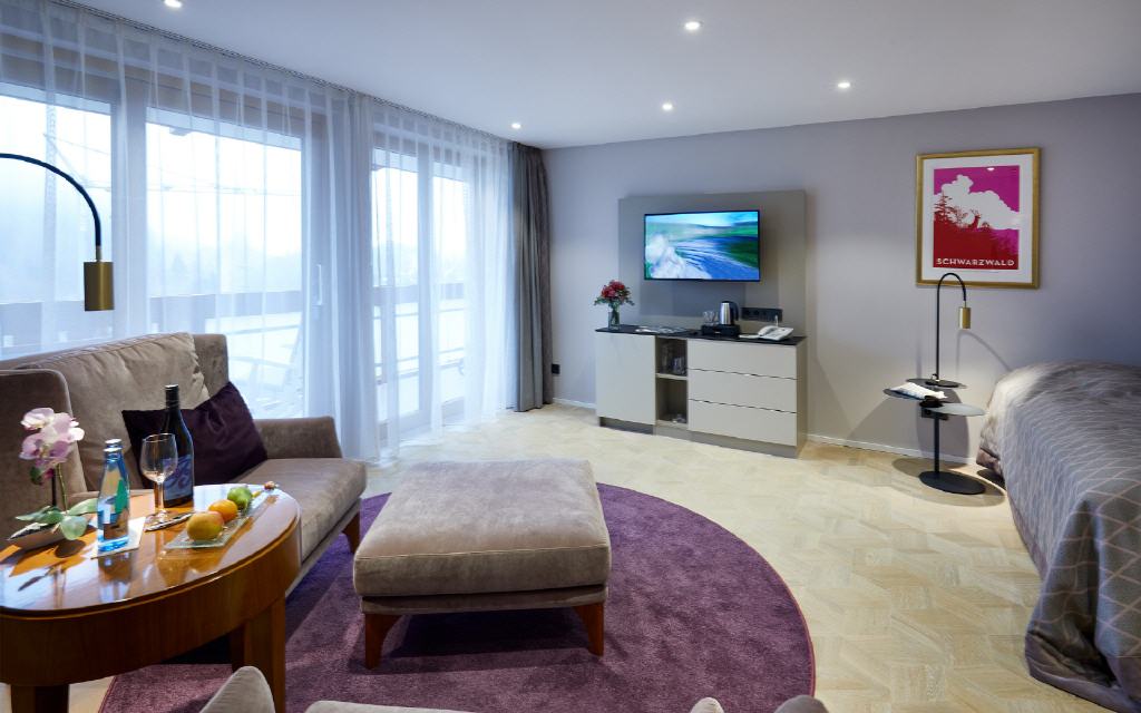 Suite Dreisamtal. Exklusive Suite 55 qm, Balkon 6 qm, Südwestseite zum Garten. Die Dreisam-Tal-Suiten versprichen ein exklusives Wohnerlebnis mit heimischem Flair: Die großzügig geschnittenen Suiten mit modernem Badezimmer bieten neben vielen Verwöhn-Extras auch einen besonderen Komfort durch die Möglichkeit, das Wohnzimmer auf Wunsch als zweites Schlafzimmer mit Einzelbett zu nutzen. Ideal für getrennt schlafende Paare oder auch für 3 Personen. Sorgfältig ausgewählte Details betonen die gehobene Extraklasse.