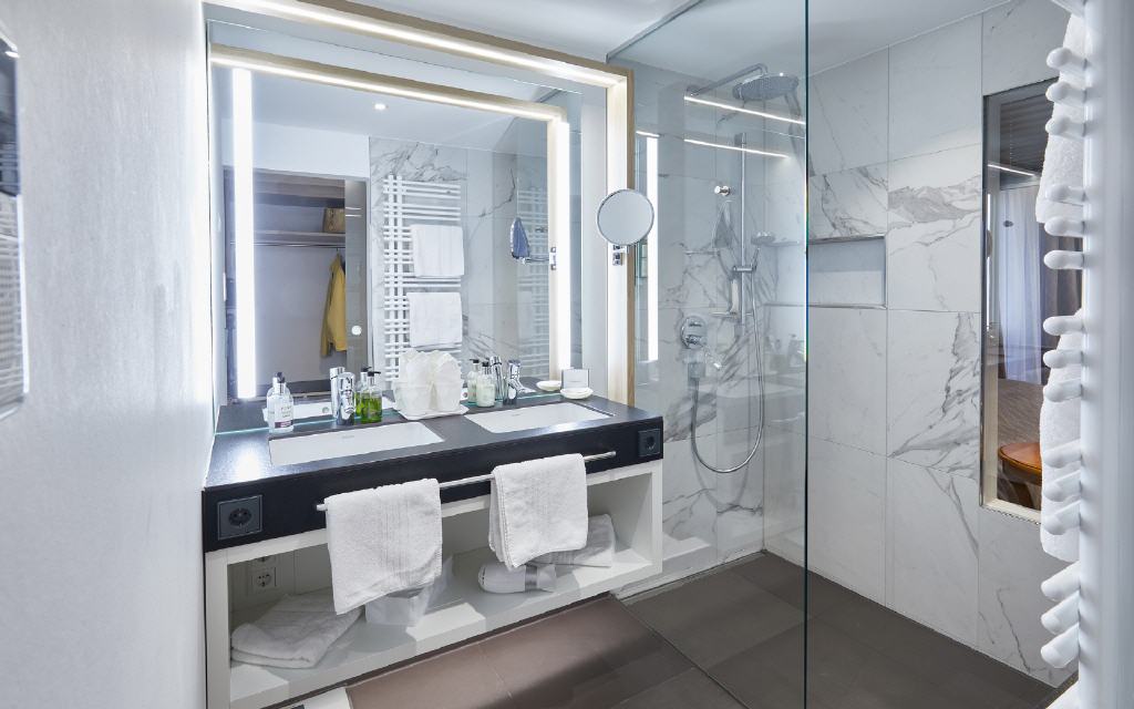 Unsere Zimmer und Suiten bestechen durch ihr stilsicheres Design und ihre großzügige Ausstattung mit vielen hochwertigen Verwöhn-Extras. Der gekonnte Mix aus exquisiten Materialien und warmen Farben verleihen dem Interieur harmonische Behaglichkeit. Die geschmackvolle Einrichtung strahlt ein edles und zugleich warmes Flair aus.
