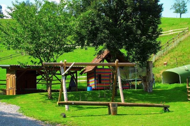 Von der Terrasse sehen sie direkt auf unseren Spielplatz, damit sie Ihre Kleinsten im Auge haben, denn die gute Idee eines Familienurlaubes bei uns auf dem Hochenhof besteht darin, viel Zeit mit zufriedenen Kindern zu verbringen.